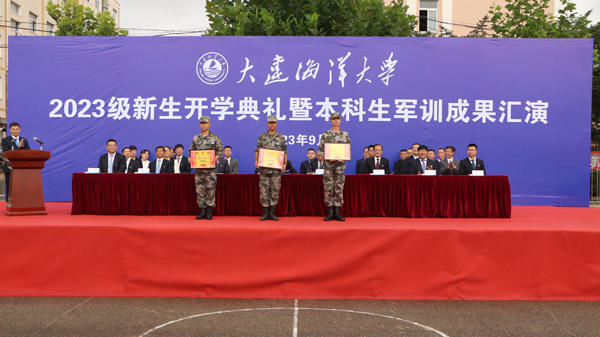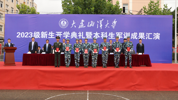 全体新生们以饱满的热情进行了军训队列展示等成果汇演,展示出了大海大学子们昂扬奋发的青春风貌。学院党委副书记段庆臻宣布了军训成果表彰名单,与会领导为获奖教官和连队代表颁奖。
